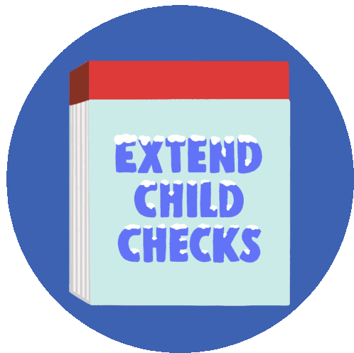 A calendar animation showing "EXTEND CHILD CHECKS" with seasonal changes, advocating for continued child tax credits.