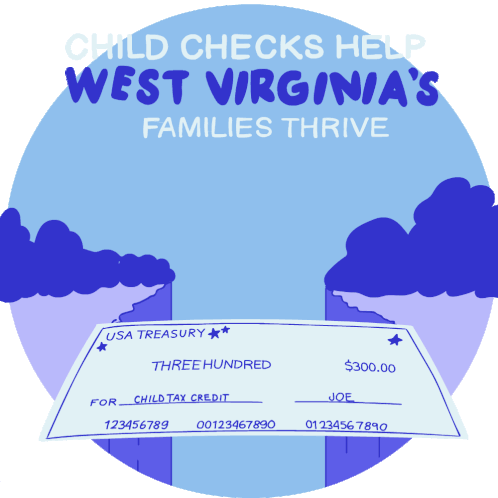 An animated illustration shows families walking over a child tax credit check, highlighting how child checks help West Virginia families thrive.