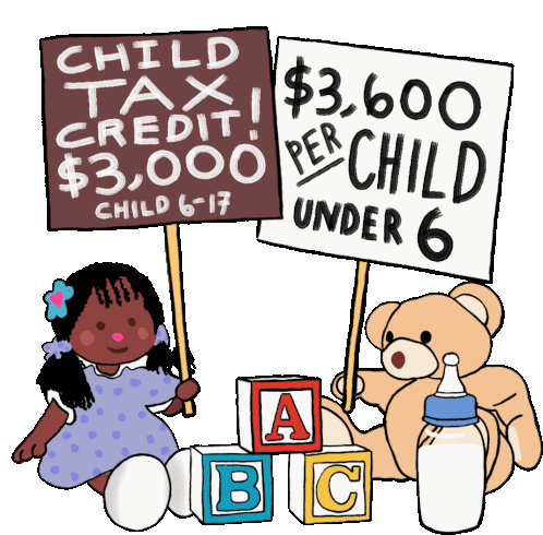 An animated sticker illustrating the Child Tax Credit, showing $3,000 for children 6-17 and $3,600 for children under 6, with a doll and teddy bear.