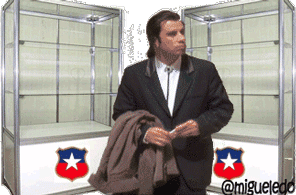 A confused man, resembling John Travolta's Vincent Vega, looks around empty display cases with Chilean shields, reflecting a 'sincopas' or 'missing' situation.
