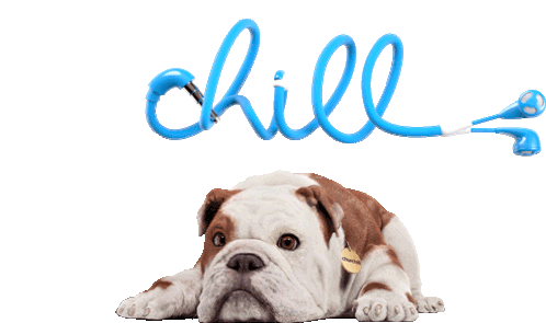 A relaxed bulldog named Churchill lies down while blue headphones spell out 'chill' above him, perfect for a calm mood.