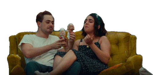 Dacre Montgomery and Geraldine Viswanathan share a sweet moment, enjoying ice cream together on a cozy couch.