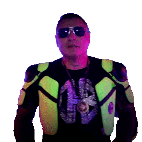 Chimo Bayo, the iconic Spanish DJ, performs his signature 'Hu-Ha' move with energetic hand gestures and sunglasses.