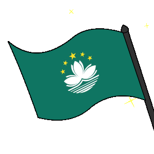 A cute cartoon Pudgy Penguin stands on a red platform, proudly waving the green flag of Macau.