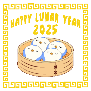 a happy lunar year 2025 greeting card with a bamboo steamer filled with dumplings
