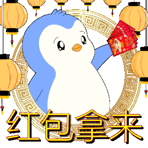 a blue and white penguin holding a bunch of red envelopes with chinese writing