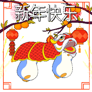 a chinese new year greeting card with penguins and a dragon