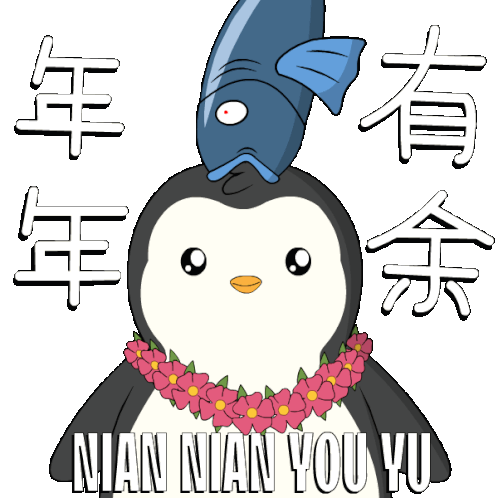 a cartoon penguin with a fish on its head and the words mian mian you yu below it