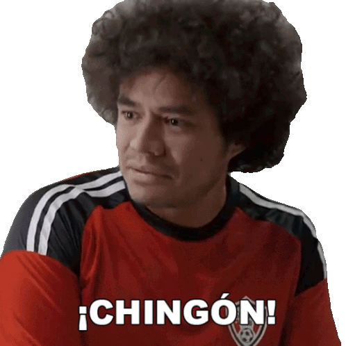 Memo Villegas, with his signature curly hair, looks surprised while wearing a red soccer jersey and exclaiming '¡Chingón!'