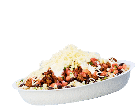A mouth-watering Chipotle burrito bowl overflowing with rice, beans, meat, salsa, sour cream, and shredded cheese.
