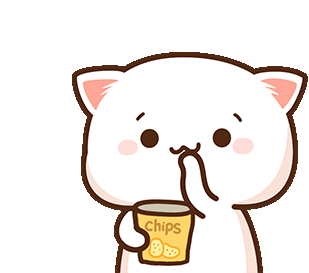 The adorable Mochi Peach cat character enjoys a tasty snack, munching on chips from a bag with a happy expression.