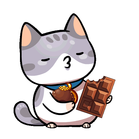 A cute cartoon cat happily devours a chocolate bar and truffle, celebrating Chocolate Day with pure joy and love.