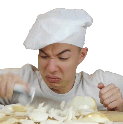 Motoki Maxted struggles with chopping onions, making a pained face as his eyes burn from the fumes.