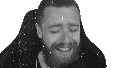 Luba, a bearded man, appears deeply emotional and sad, with tears or rain falling around him as he covers his face.