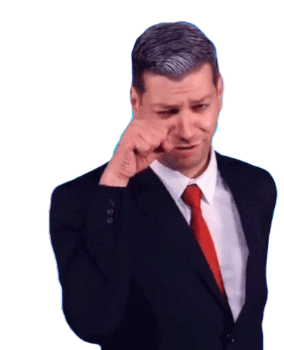 A man in a suit, an imitation of William Bonner, makes a crying gesture with an upset expression, a sticker from Galo Frito.