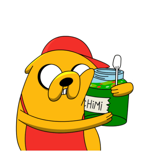 Jake from Adventure Time, wearing a red cap and apron, is about to enjoy a delicious choripan with chimichurri sauce.