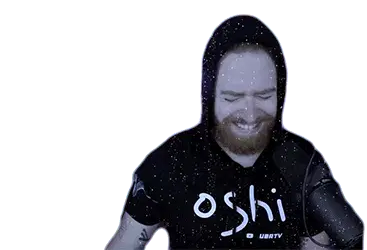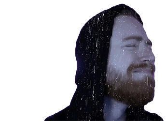 Lucas Feurschutte with eyes closed, head tilted up, appearing saddened or crying as rain or snow falls around him.