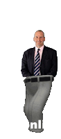 Chris Barrie as Bean Dwarf, a man in a suit and tie, stands with oversized, animated walking pants.
