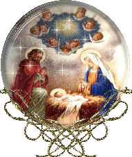 A beautiful Christmas sticker depicting the Holy Family, baby Christ, and angels in a glowing nativity scene.