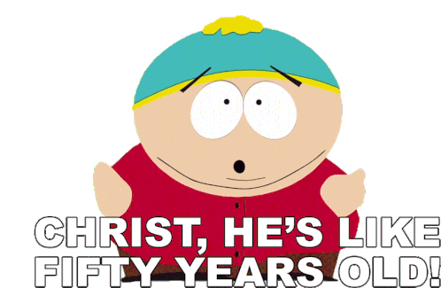 Eric Cartman from South Park exclaims 'Christ, he's like fifty years old!' with a shocked expression.