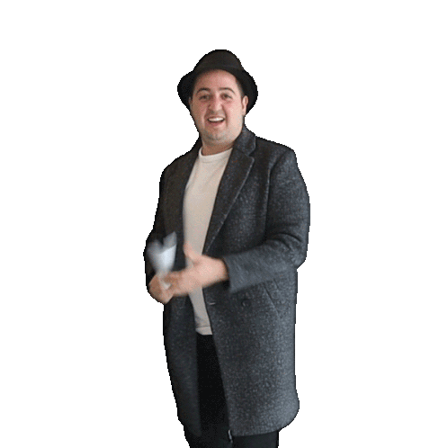Christian Gravias, wearing a hat and coat, smiles and gestures energetically, presenting during The Cg Show.