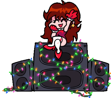 Friday Night Funkin' Girlfriend brings festive cheer, sitting on speakers adorned with colorful Christmas lights.