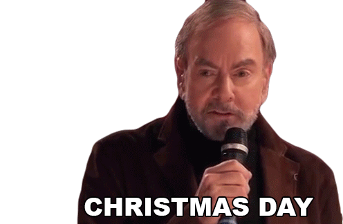 Neil Diamond, the iconic singer, speaks into a microphone, declaring 'Christmas Day'.