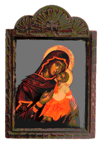 a painting of a woman holding a baby with a cross on the top