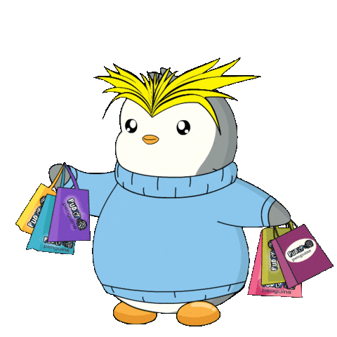 A cute Pudgy Penguin character with spiky yellow hair, wearing a blue sweater, happily waddles while carrying multiple shopping bags from Pudgy Penguins.