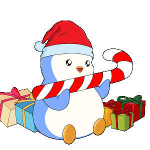 A cute penguin wearing a Santa hat holds a candy cane, surrounded by festive Christmas gifts, spreading holiday cheer.