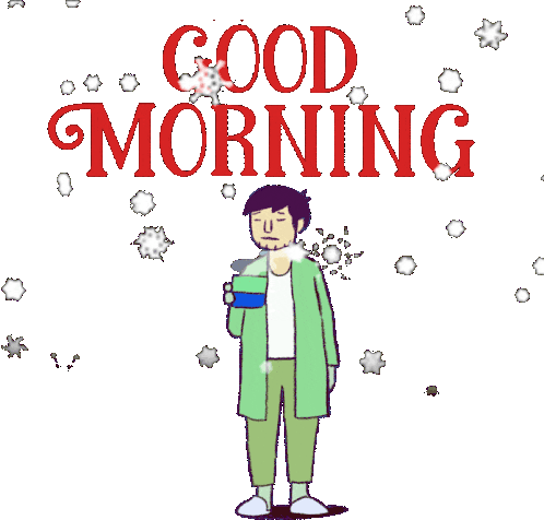 Person yawning and shivering in a robe, holding a hot drink, with 'Good Morning' text and falling snow on a cold morning.