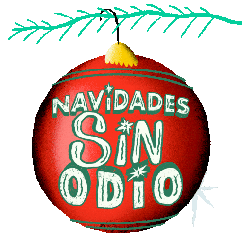 A festive red Christmas ornament with 'Navidades Sin Odio' (Christmas Without Hate) text, sparkling on a pine branch.