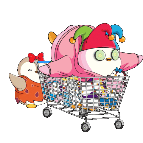 An adorable animated sticker of Pudgy Pokemon celebrating Christmas with a shopping cart, perfect for holiday sales.