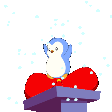 A cute cartoon penguin floats above a large red Christmas bow resting on a purple chimney, with snowflakes gently falling.