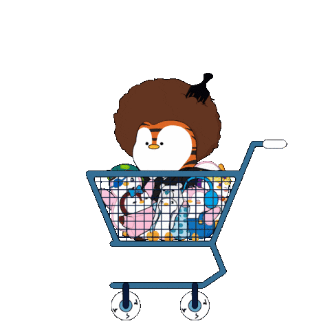 A cute tiger character with an afro drives a shopping cart overflowing with plush toys, perfect for Christmas shopping.