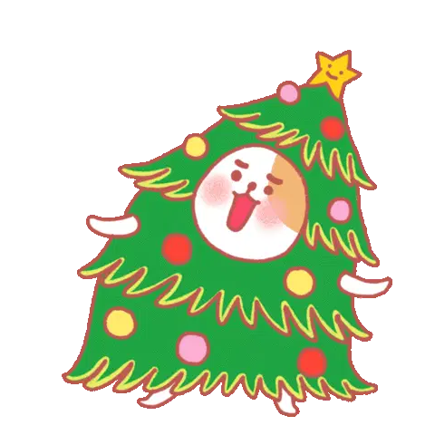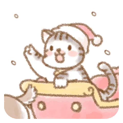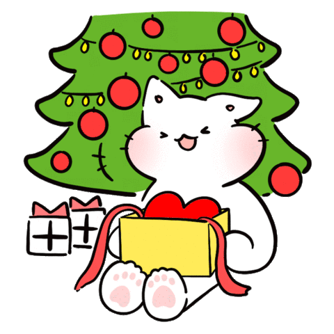 A cheerful white cat sits by a festive Christmas tree, happily opening a yellow gift box to reveal a red heart. Two wrapped presents are nearby.