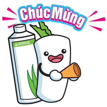 A cheerful cartoon mascot, possibly for Herbalife VN, holds a megaphone next to a Herbalife nutrition bottle, celebrating with a festive spirit.