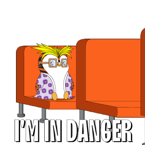 A nervous cartoon penguin, Chuckles, sits in a chair with "I'm in Danger" text, expressing stress and trouble.