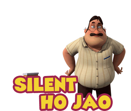 Dheeru, a cartoon character, sternly gestures with a book, demanding silence with the text 'SILENT HO JAO'.