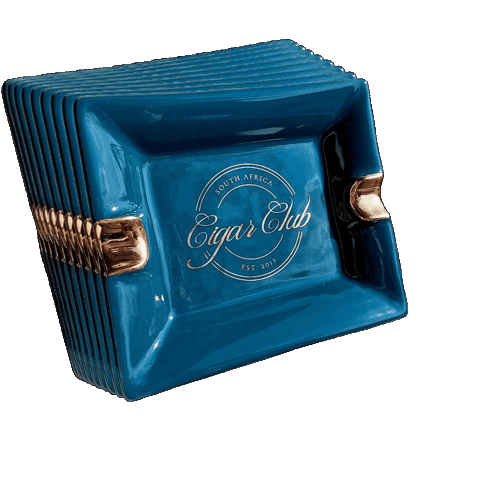 a blue cigar club ashtray is stacked on top of other ashtrays
