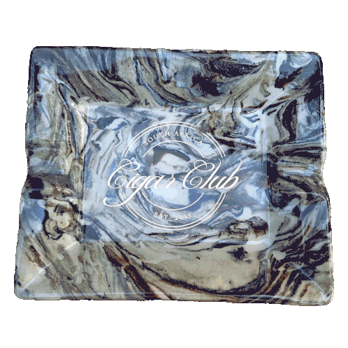 Animated sticker showcasing a rectangular ashtray with the 'Cigar Club South Africa' logo, transitioning through various marbled designs.