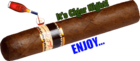 A large cigar with 'It's Cigar Night! ENJOY...' text, featuring a bottle pouring a drink into a glass.