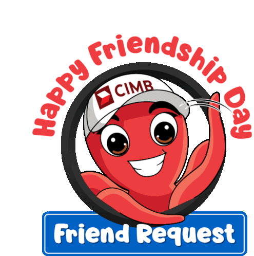 Cimbocto, the red octopus mascot, celebrates Happy Friendship Day, wearing a CIMB cap and waving.