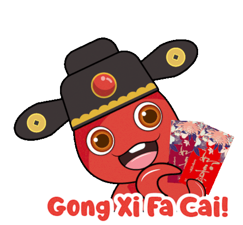 Cimb Octo character celebrates Chinese New Year, wearing a traditional hat and holding red angpow envelopes, wishing 'Gong Xi Fa Cai!'