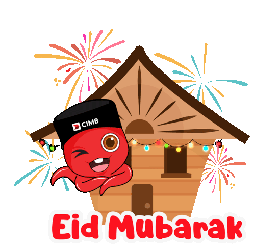 CIMB's Octo character celebrates Eid Mubarak in front of a festive house with fireworks, spreading joy for Raya.
