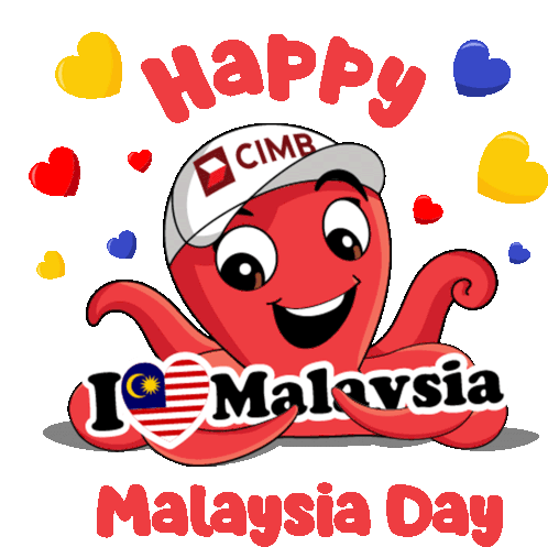 CIMB's cheerful Octo character celebrates Malaysia Day with hearts and the message 'I Love Malaysia'.