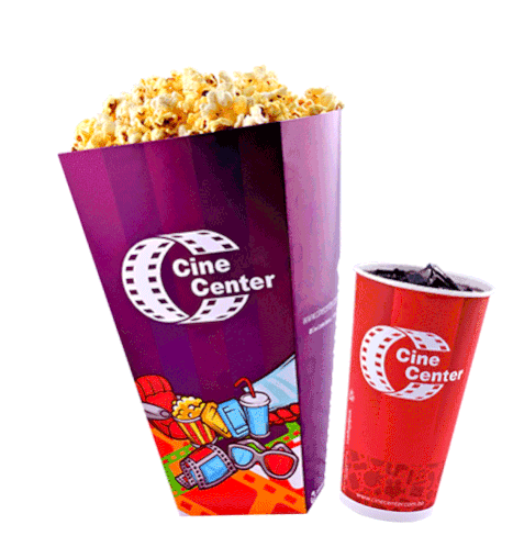 Animated sticker featuring a large Cine Center popcorn bucket and a soda cup, perfect for movie night fun.