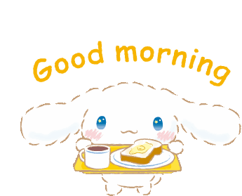 Cinnamoroll, the adorable Sanrio character, holds a tray with buttered toast and coffee, wishing a good morning.
