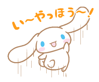 Cinnamoroll, the white Sanrio dog, waves excitedly with the Japanese text "い〜やっほう〜!" (Yoo-hoo!) appearing.