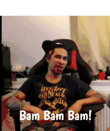 A man in a gaming chair enthusiastically says 'Bam Bam Bam!' with hand gestures, then bursts into laughter.